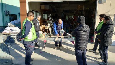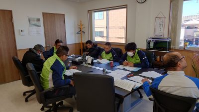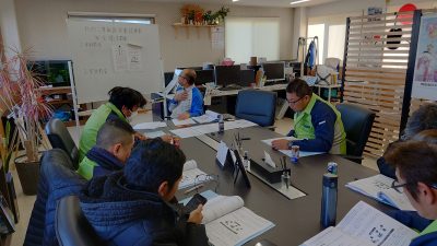 さて本日は、現場が休所で全員が揃いましたので安全衛生教育の「丸のこ等取扱作業従事者教育」の講習会を開催しています。                            安全衛生教育を受講済の人も再教育を含めて、安全作業をする上で重要な資格と安全衛生教育をしっかりと行う事を目的として行っています。