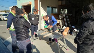 「丸ノコ等取扱作業従事者」の安全衛生教育は、学科が3.5時間実技が0.5時間の合計4時間の講習が必要です。現場で作業する作業員さんが座学にて講習を受けている印象は一般の方には少ないと思います。                                  実技講習で特に安全に重点をおいて丸ノコの扱い方を説明してくれています。現場では落ち着て熟練者の手先の動きを凝視する事が少ないので良い機会となりました。